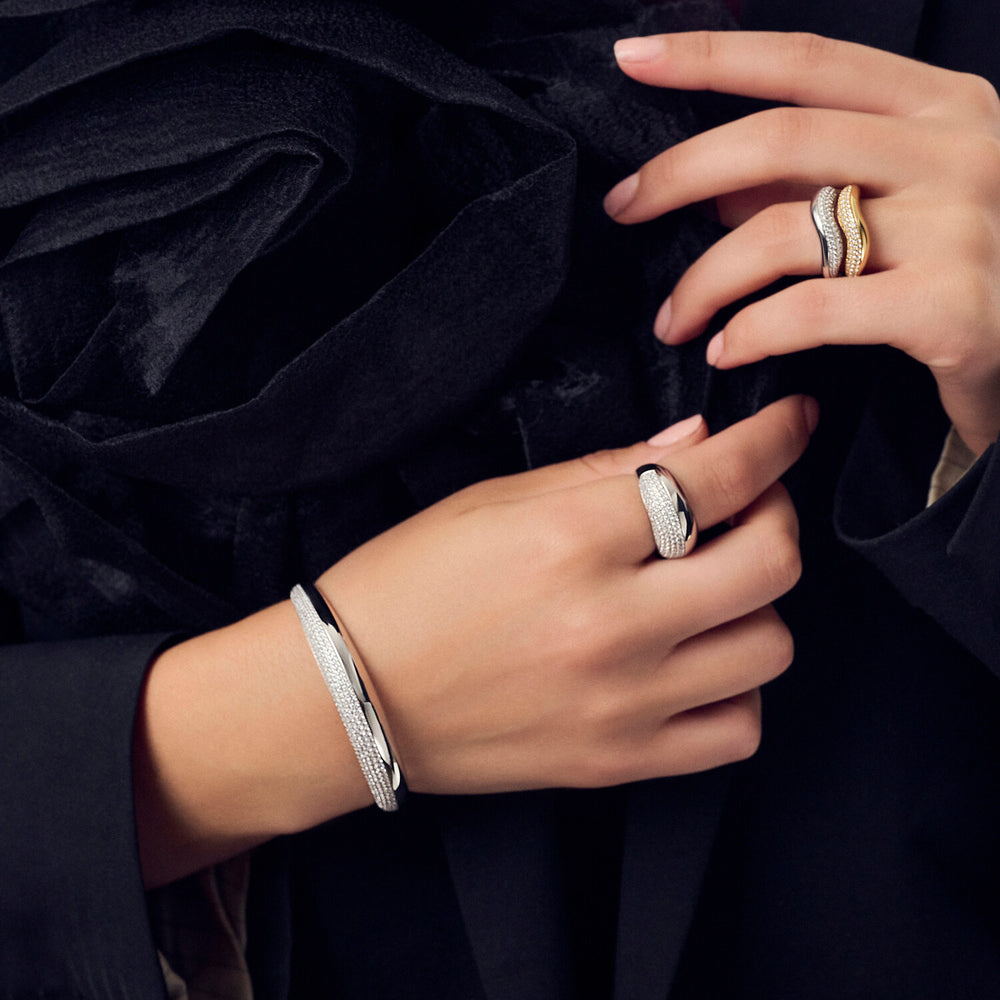 Den renaste formen av silver som används vid smyckestillverkning, bestående av 92,5% silver och 7,5% alternativa metaller för styrka. Sif Jakobs erbjuder silverssmycken pläterade med rhodium för en polerad finish.