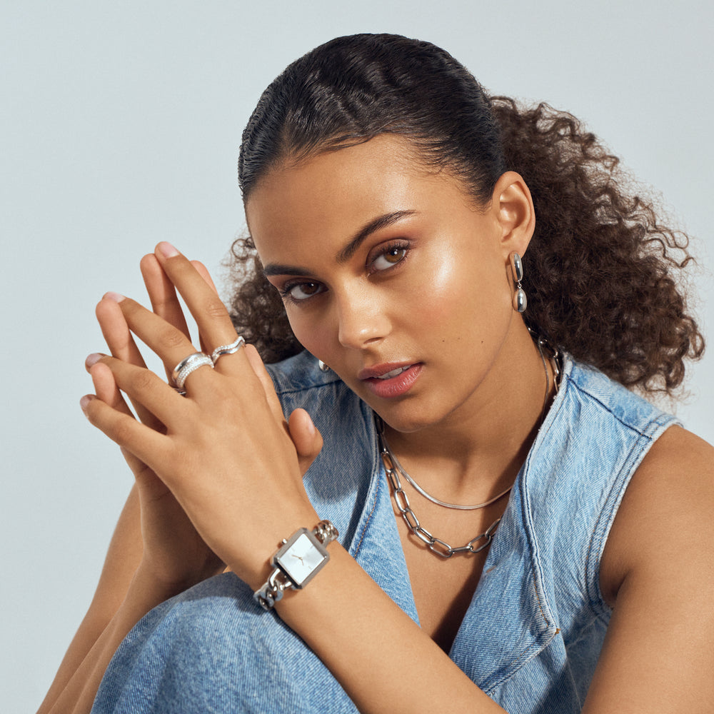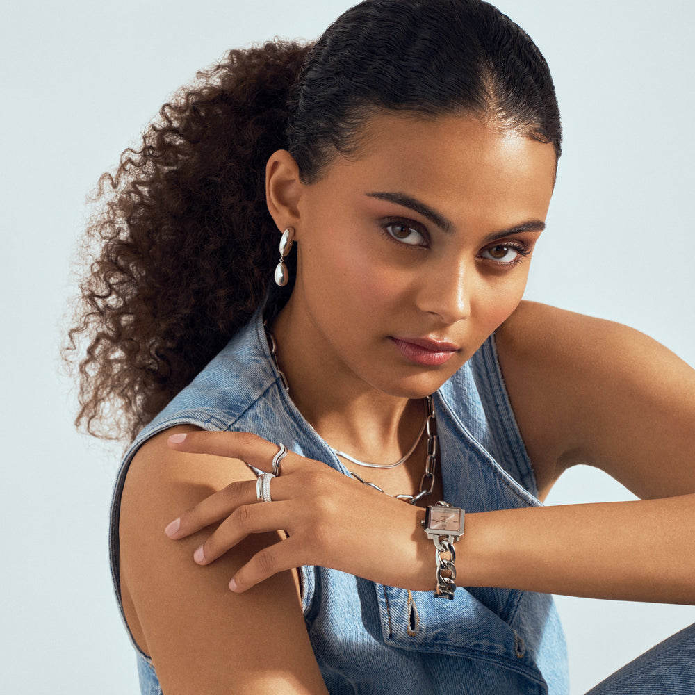 Den renaste formen av silver som används vid smyckestillverkning, bestående av 92,5% silver och 7,5% alternativa metaller för styrka. Sif Jakobs erbjuder silverssmycken pläterade med rhodium för en polerad finish.