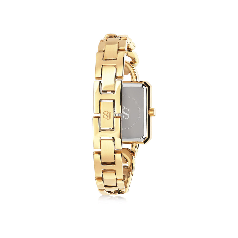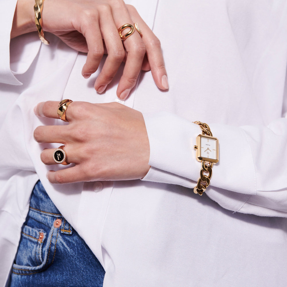 Klocka av guldpläterat rostfritt stål, polerad yta, med safirglas och vit pärlemor urtavla. Vattenbeständighet 30 m. Rörelse Miyota.