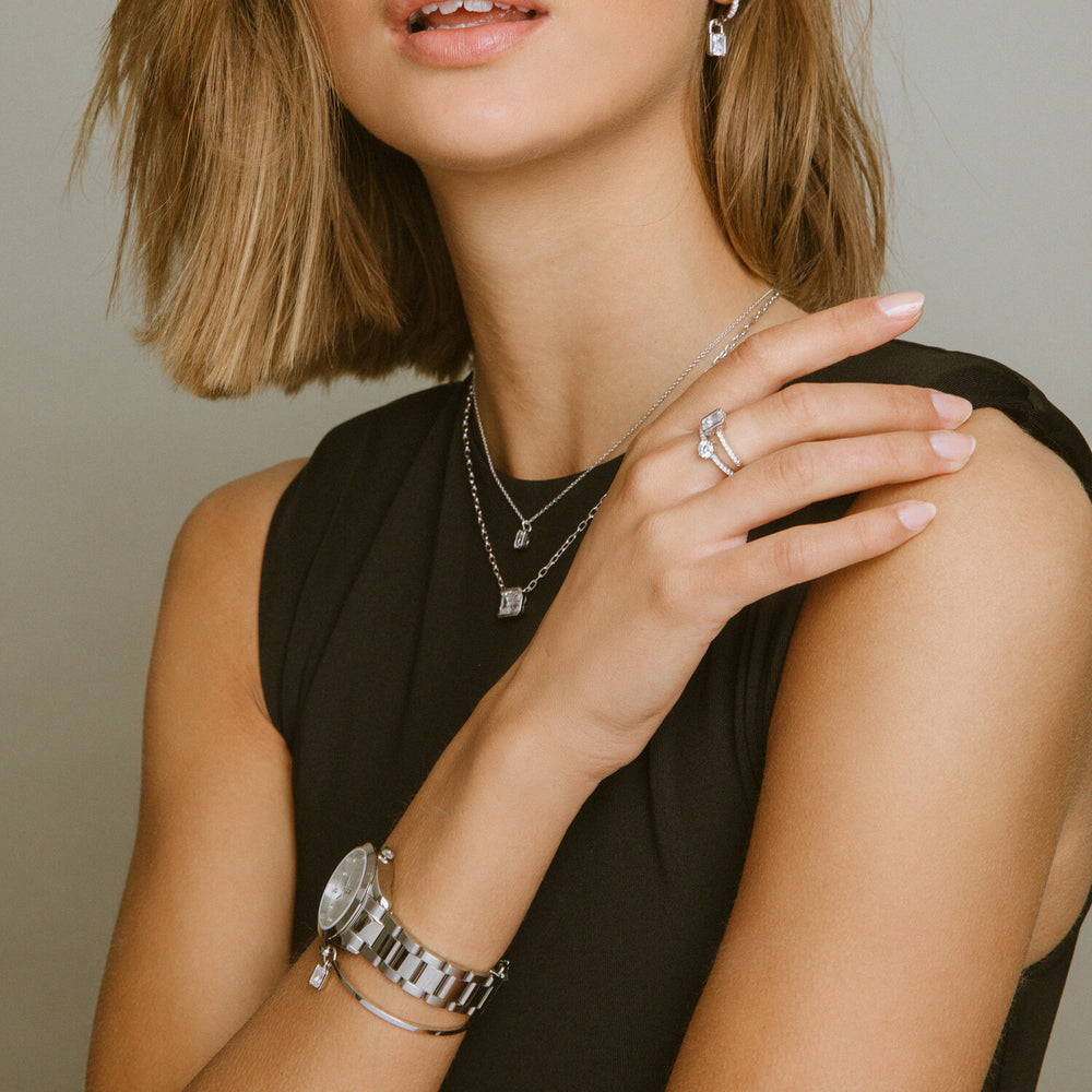 Den renaste formen av silver som används vid smyckestillverkning, bestående av 92,5% silver och 7,5% alternativa metaller för styrka. Sif Jakobs erbjuder silverssmycken pläterade med rhodium för en polerad finish.