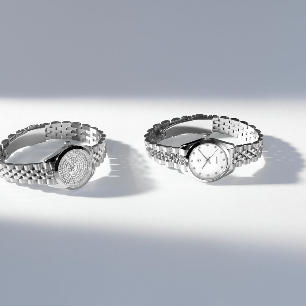 Klocka gjord av rostfritt stål, polerad och borstad yta, med safirglas och en vit urtavla med vita zirkoner. Vattentålig till 50 m Miyota rörelse