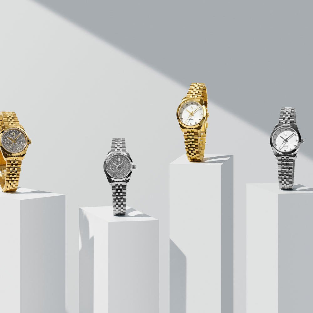 Klocka gjord av guldförgyllt rostfritt stål, polerad och borstad yta, med safirglas och en vit urtavla med vita zirkoner. Vattentålig till 50 m Miyota rörelse