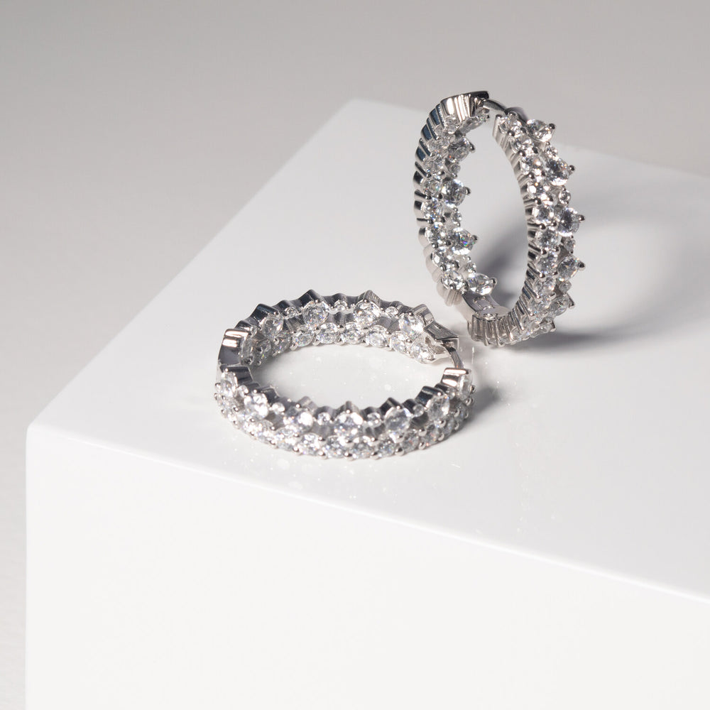 Örhängen av 925 Sterling Silver med rhodium, polerad yta och handplacerade facettslipade vita zirkoner.