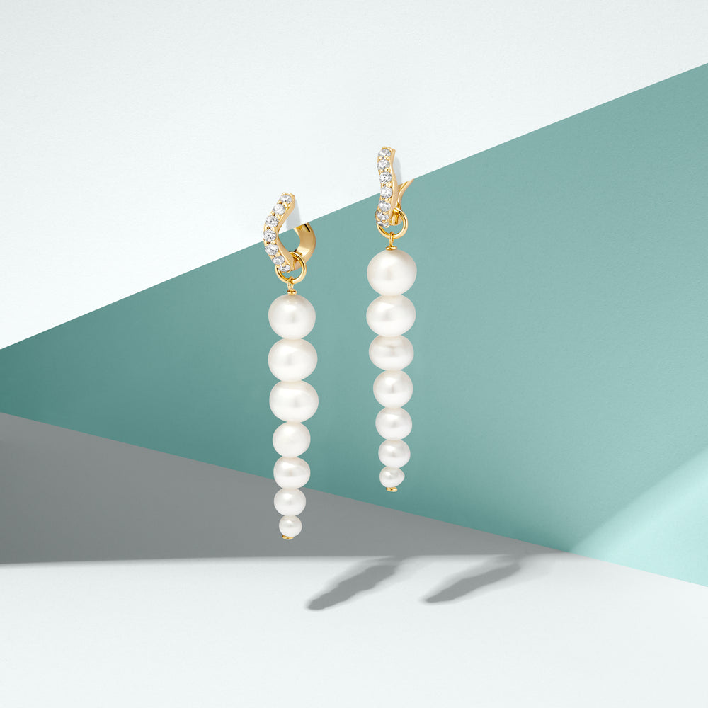 Örhängen i 18 karat guldpläterad 925 Sterling Silver med polerad yta, handplacerade vita zirkoner och glänsande sötvattenspärlor. Parlcharm är avtagbart för din egen kreativa stil. Varje pärla är handplockad och har sin egen unika form.