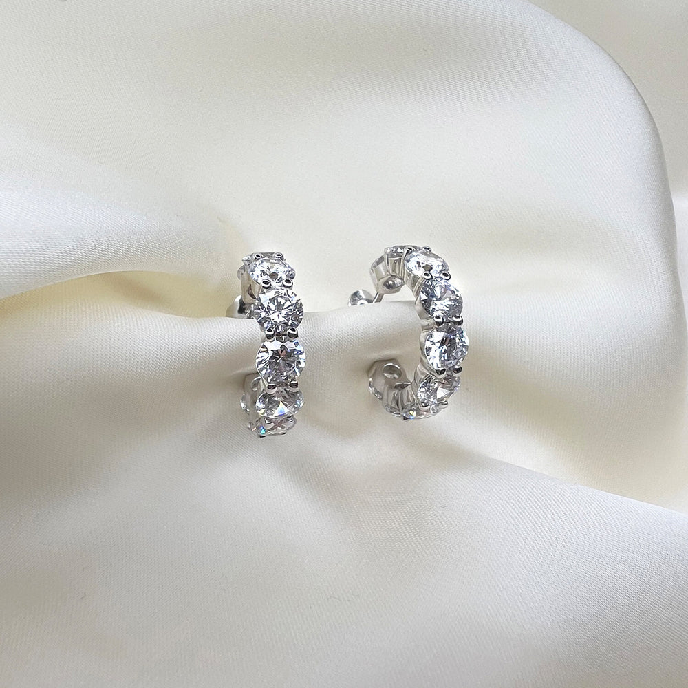Örhängen i rhodiumpläterat sterlingsilver 925, gläsande polerad yta och fasetterade vita zirkoner.