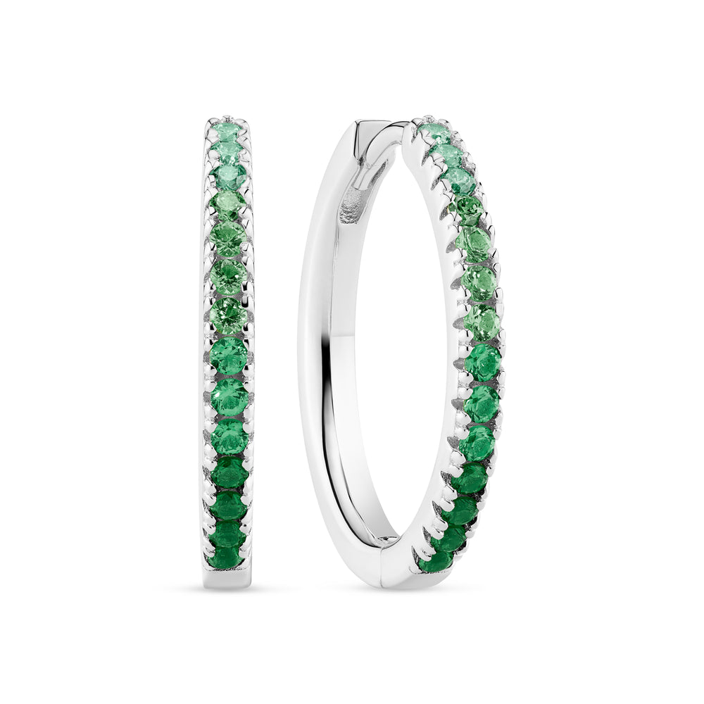 Örhängen tillverkade av 925 sterlingsilver med rhodium, polerad yta och infattade med facettslipade zirkoner i gradienttoner av grönt och vitt.