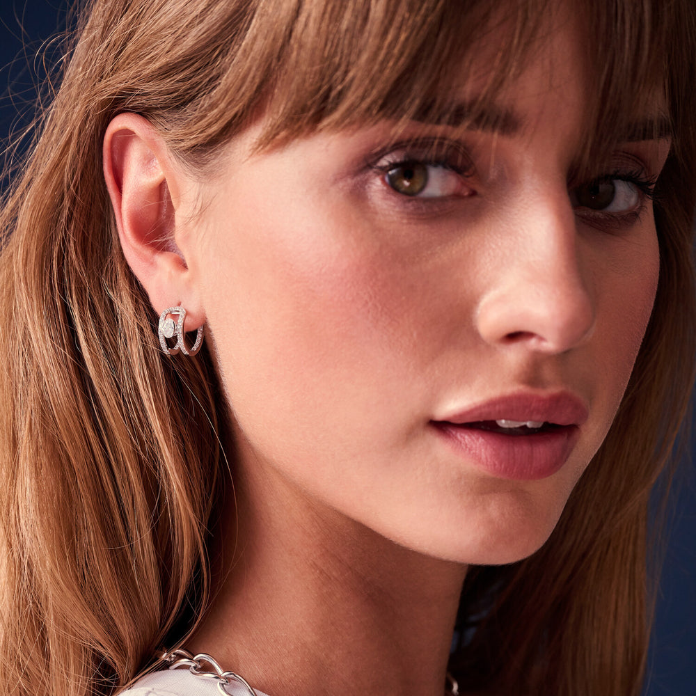 Örhängen av 925 Sterling Silver med rhodium, polerad yta och handplacerade facettslipade vita zirkoner.