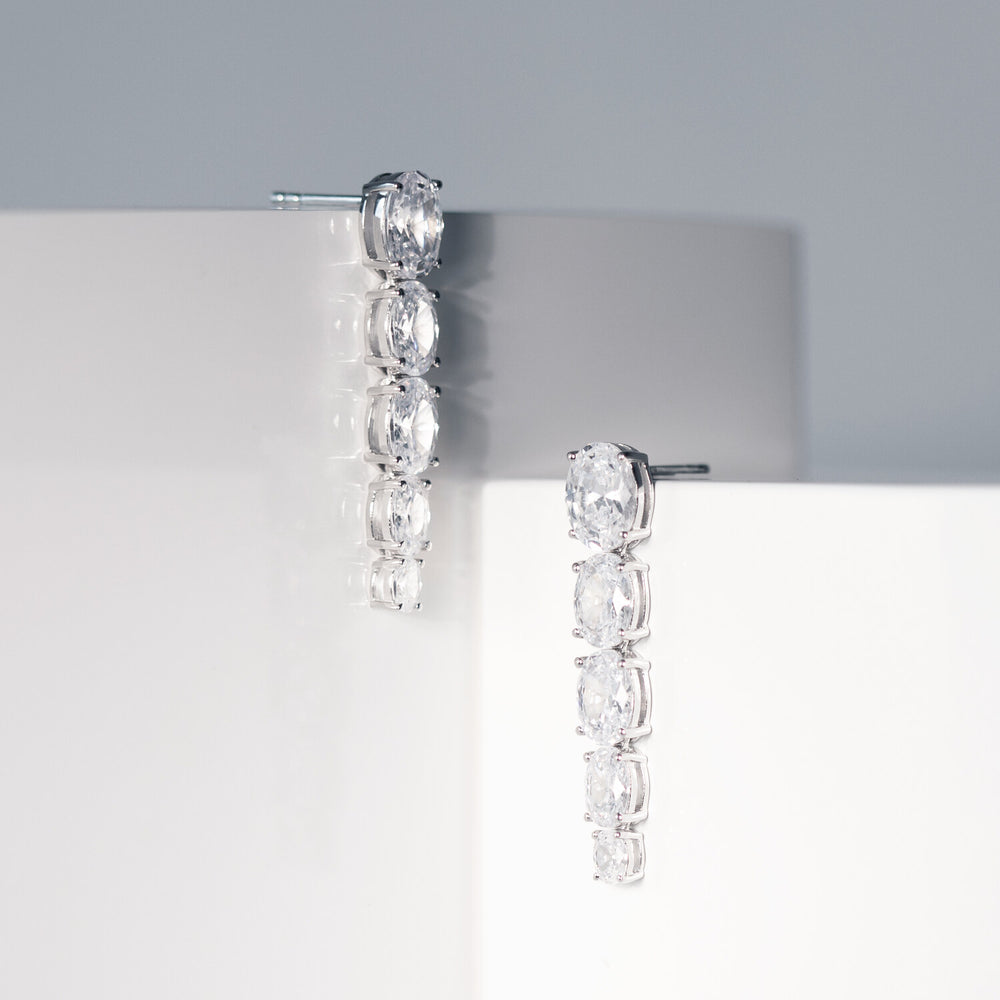 Örhängen av 925 Sterling Silver med rhodium, polerad yta och handplacerade facettslipade vita zirkoner.