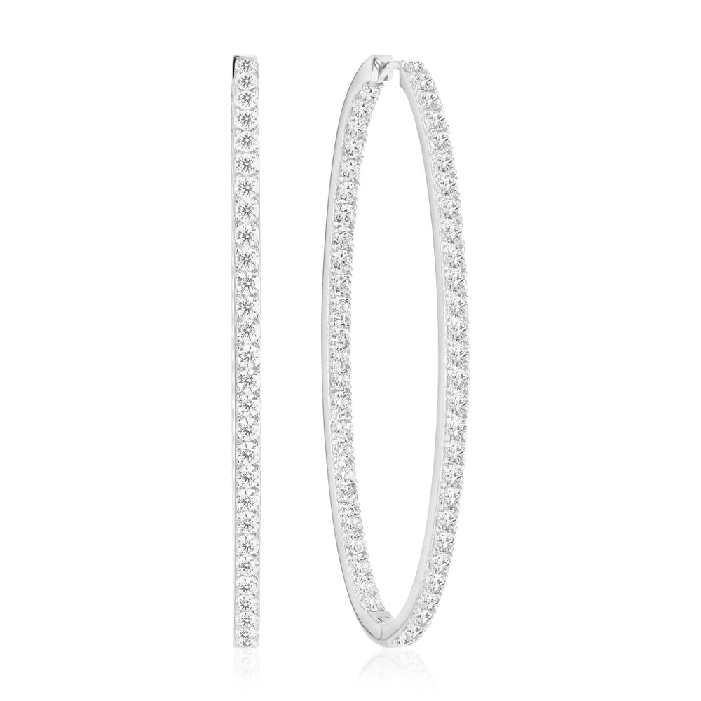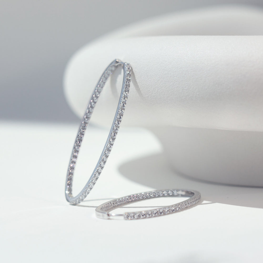Örhängen av 925 Sterling Silver med rhodium, polerad yta och handplacerade facettslipade vita zirkoner.