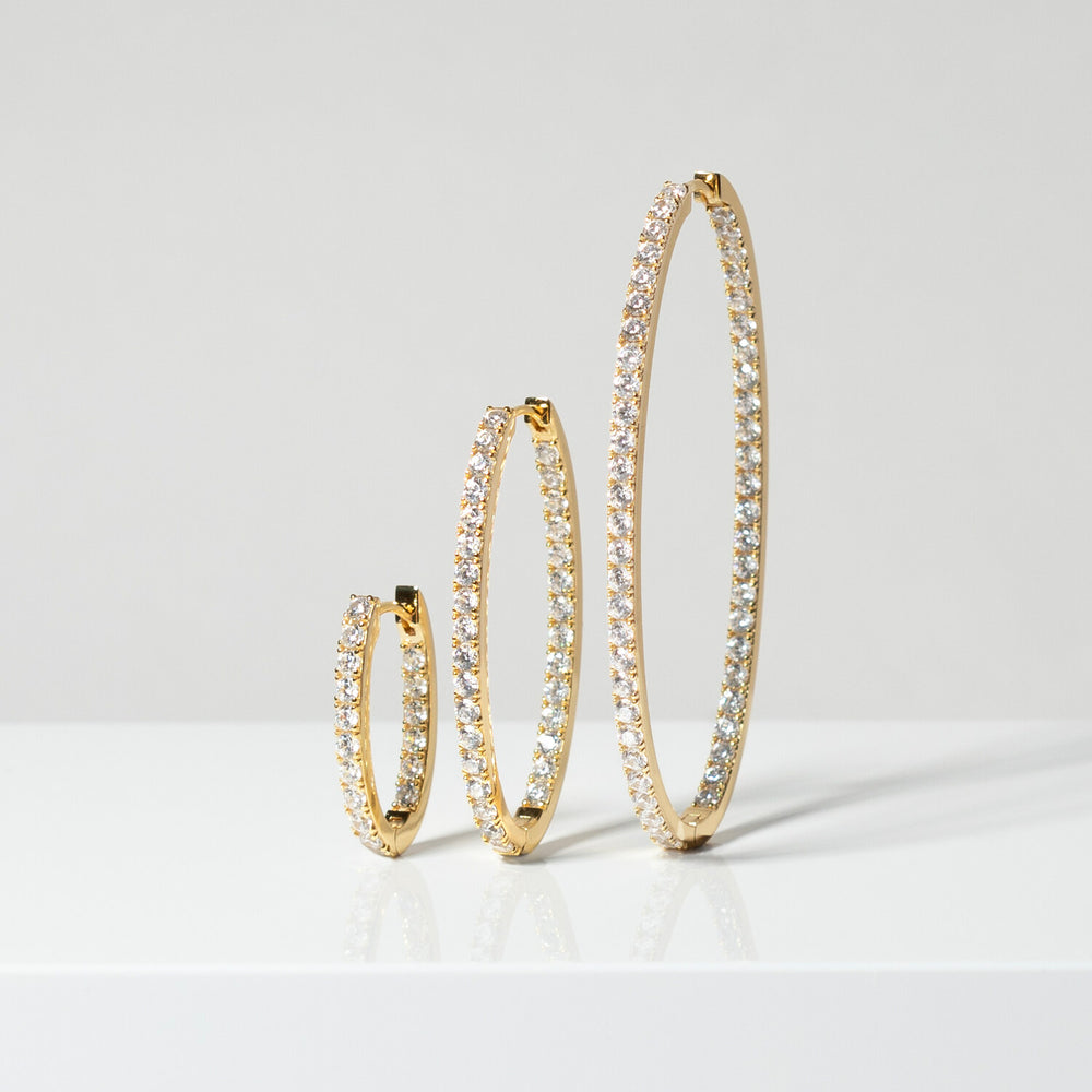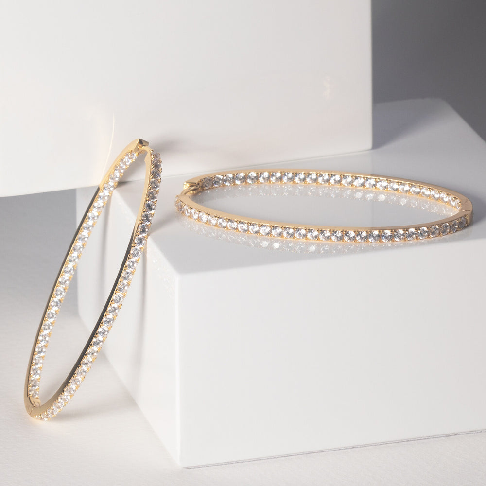 Örhängen av 18 karat guldpläterad 925 Sterling Silver, polerad yta och handplacerade med facettslipade vita zirkoner.