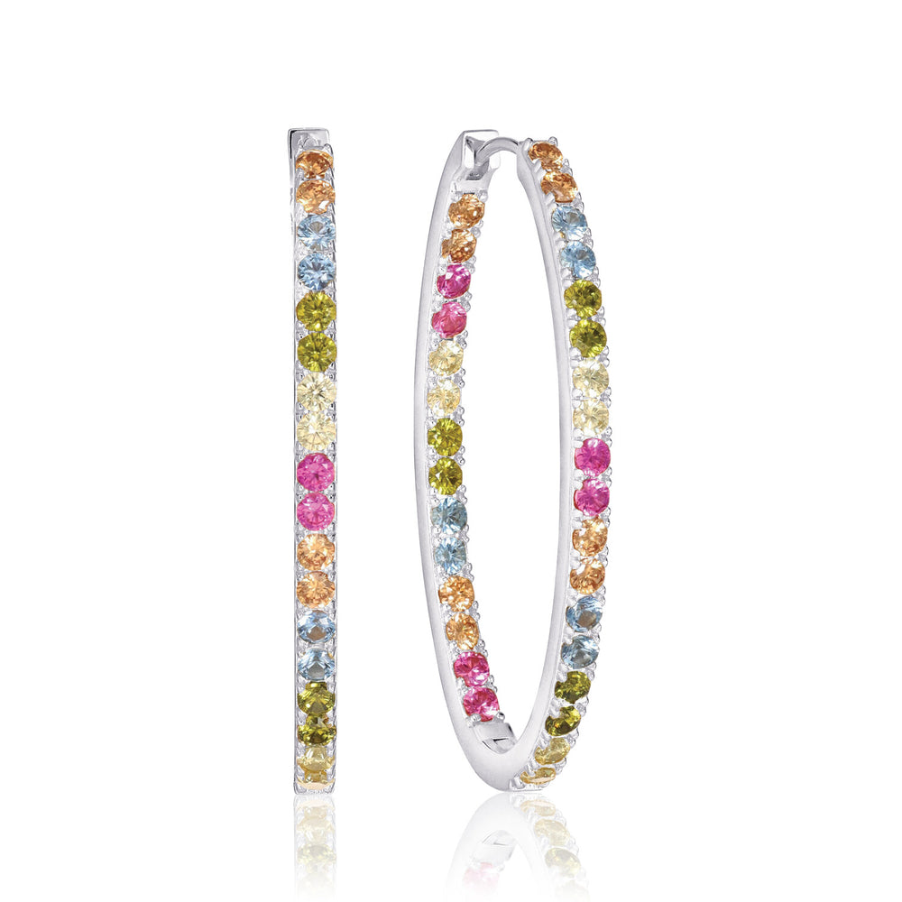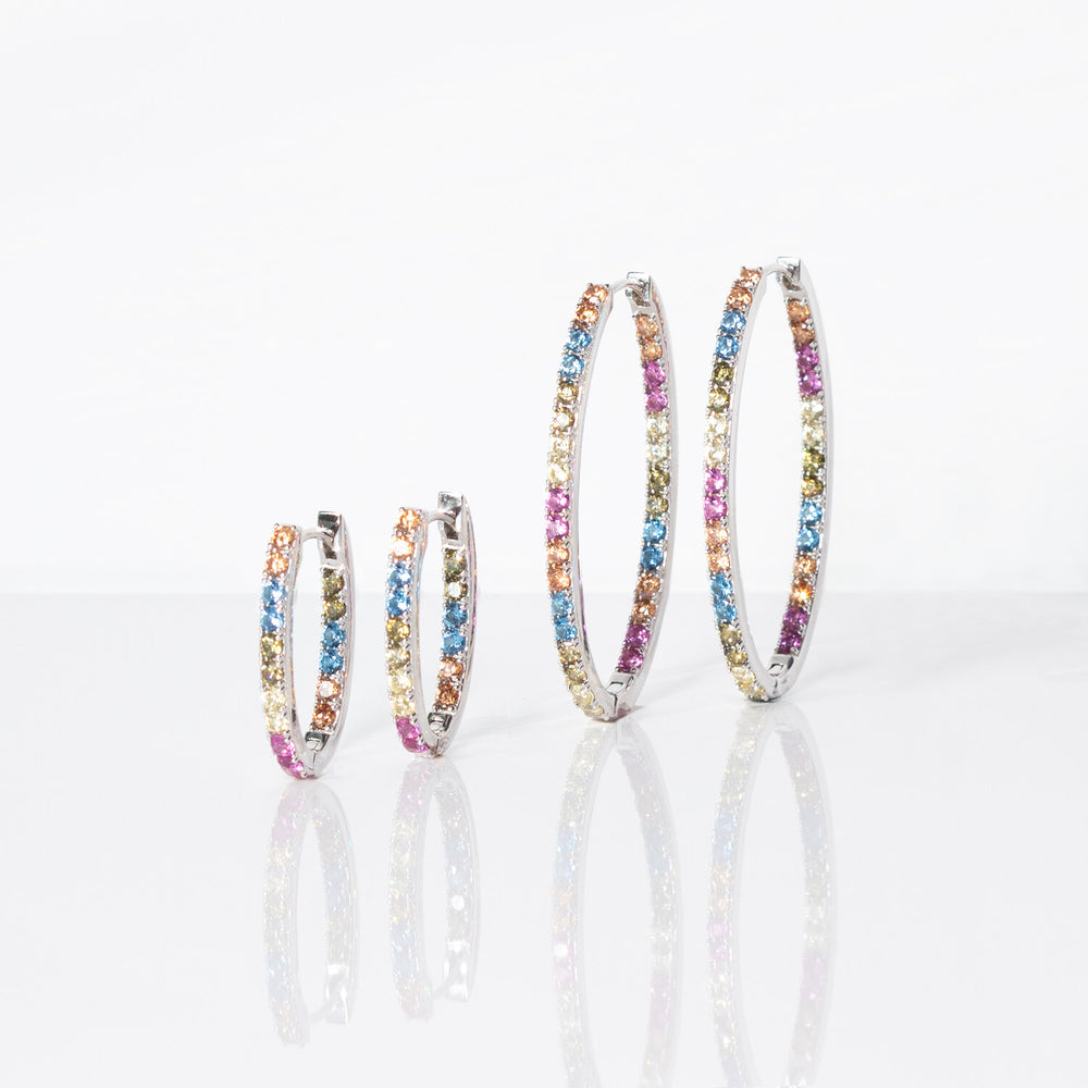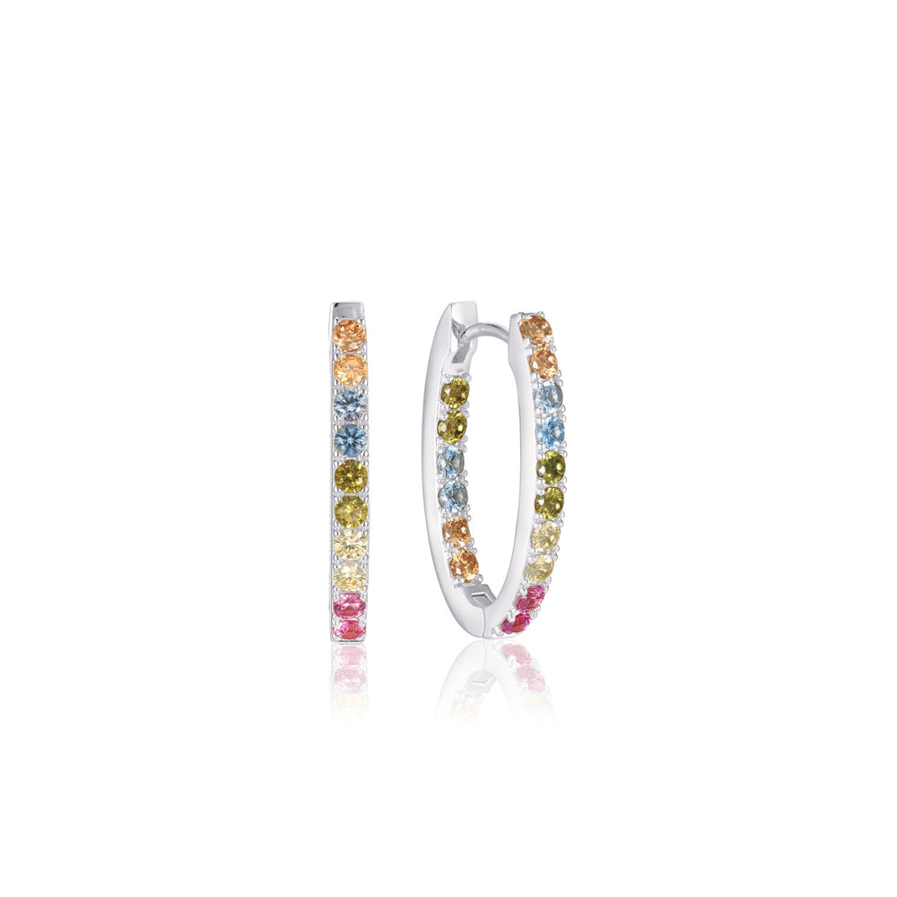 Örhängen tillverkade av rhodiumbelagt 925 sterlingsilver, polerad yta och infattade med facettslipade snitt i mångfärgade zirkoner.