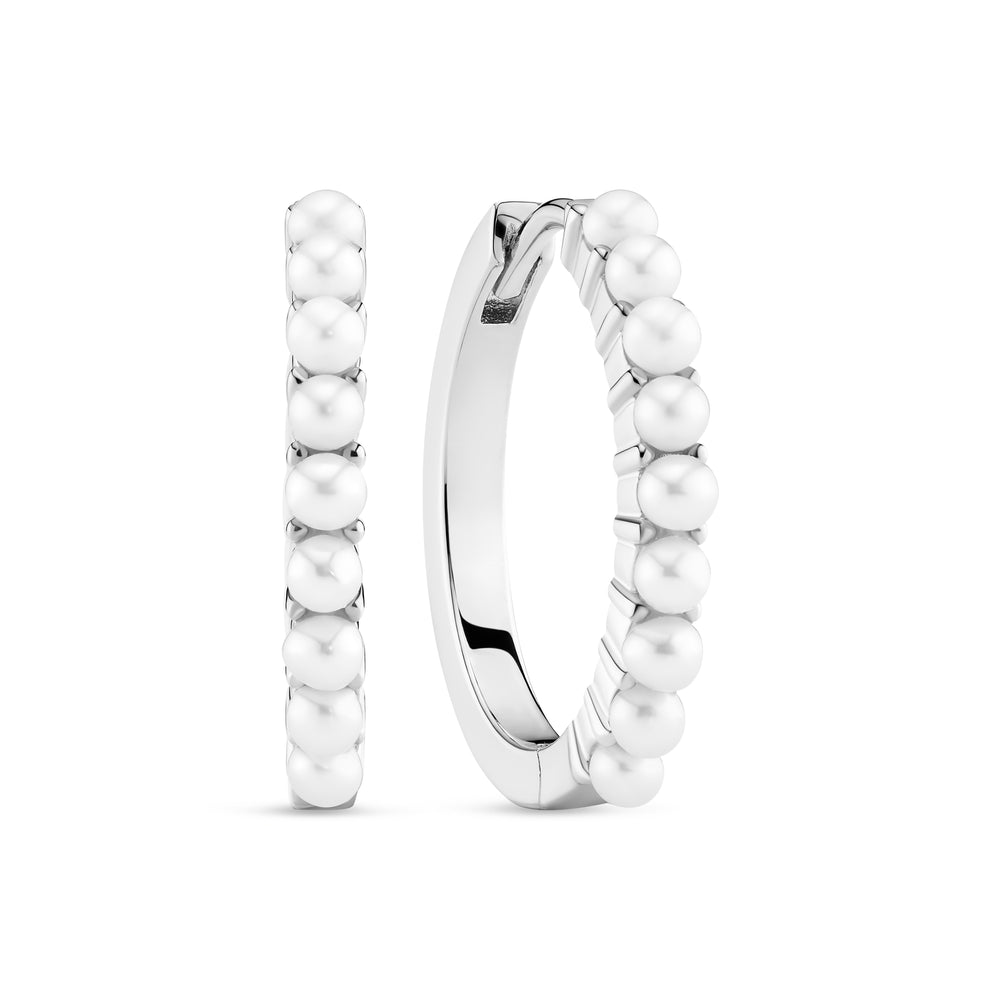 Örhängen tillverkade av 925 sterlingsilver med rhodium, polerad yta och prydda med glansiga sötvattenpärlor.