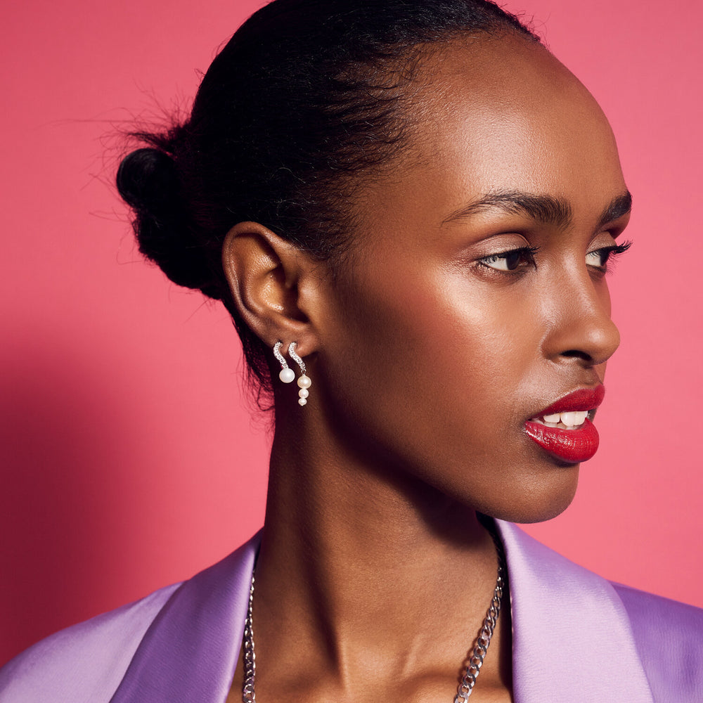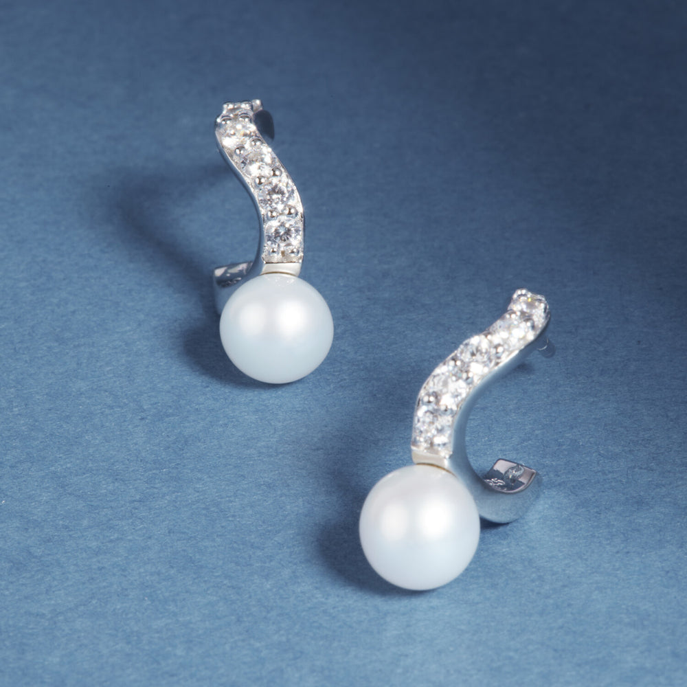 Örhängen i rhodinerat 925 Sterling silver med polerad yta och handplacerade facettslipade vita zirkoner och sötvattenspärlor.