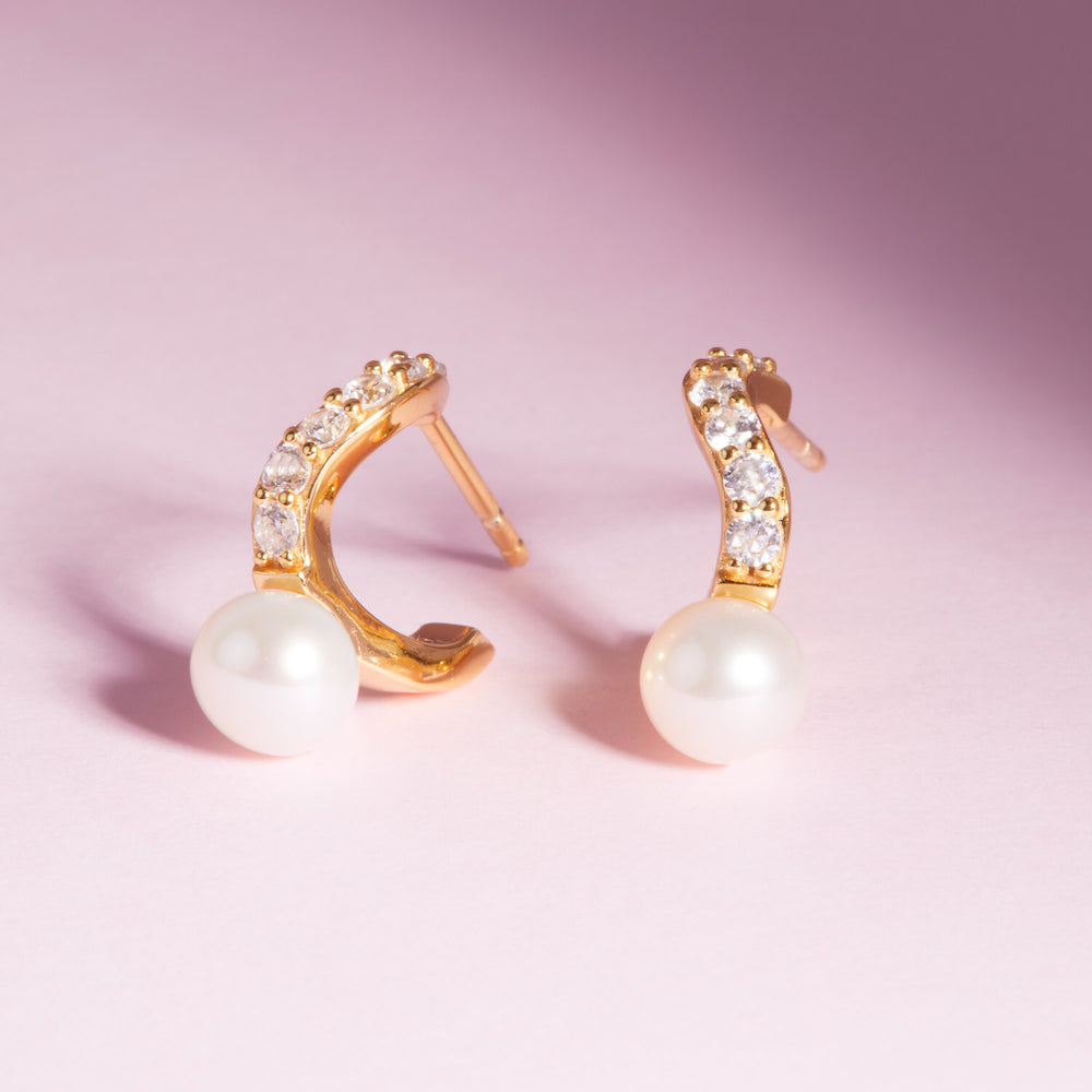 Örhängen i 18 karat förgyllt 925 Sterling silver med polerad yta och handplacerade facettslipade vita zirkoner och sötvattenspärlor.