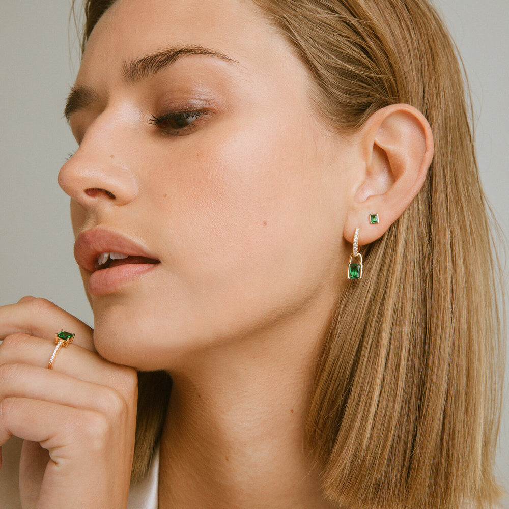 Örhängen av 18 karat guldpläterad 925 Sterling silver, polerad yta och gröna hand placerade zirconia stenar.