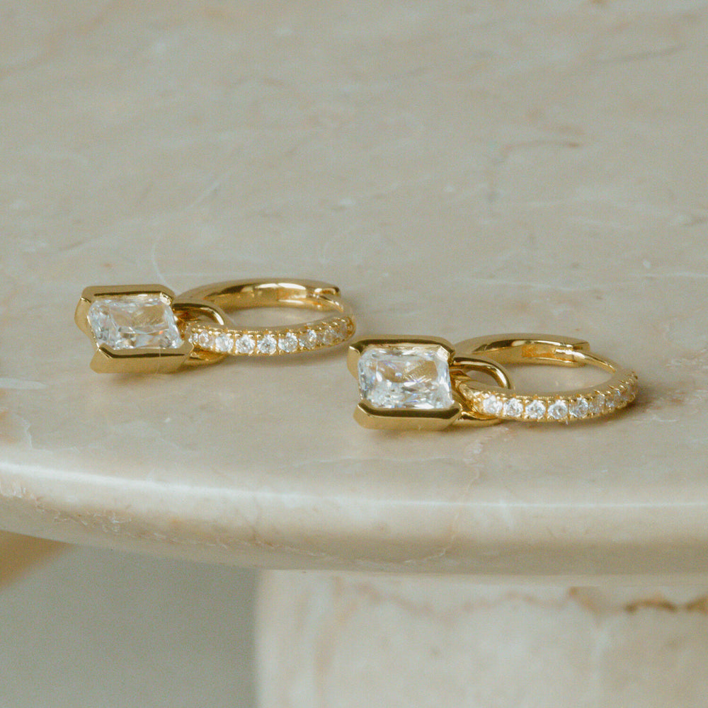 Örhängen av 925 Sterling silver med rodium, polerad yta och vita hand placerade Emerald skurna zirconia stenar.