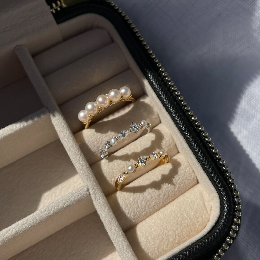 Ring i 925 sterlingsilver, rhodinerad polerad yta, med handset fasetterad vit zirkonia och sötvattenspärlor.