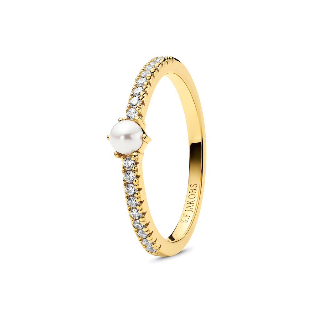 Ring i 925 sterlingsilver, guldpläterat med 18 karat guld, blank yta, fasetterad vit zirkonia och blank sötvattenspärla.