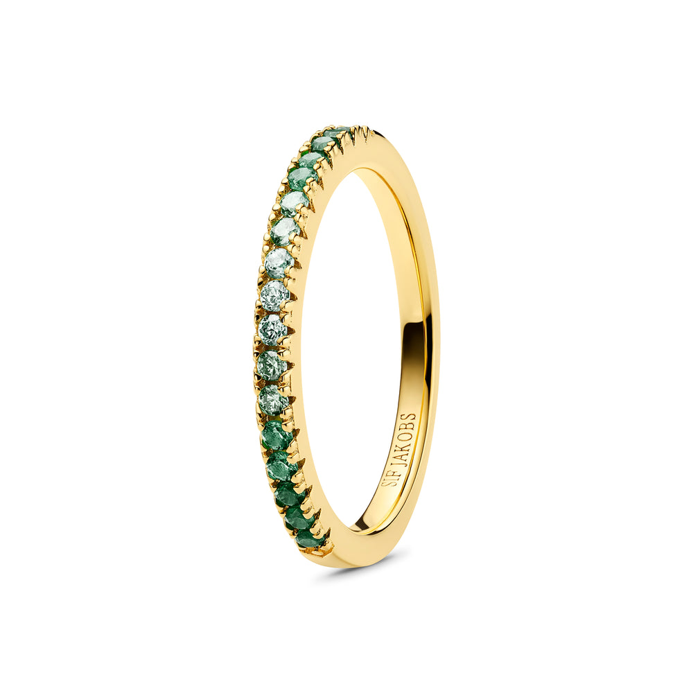 Ring tillverkad av 18 karats förgyllt 925 sterlingsilver, polerad yta och infattad med fasetterade toner av gröna och vita zirkoner.
