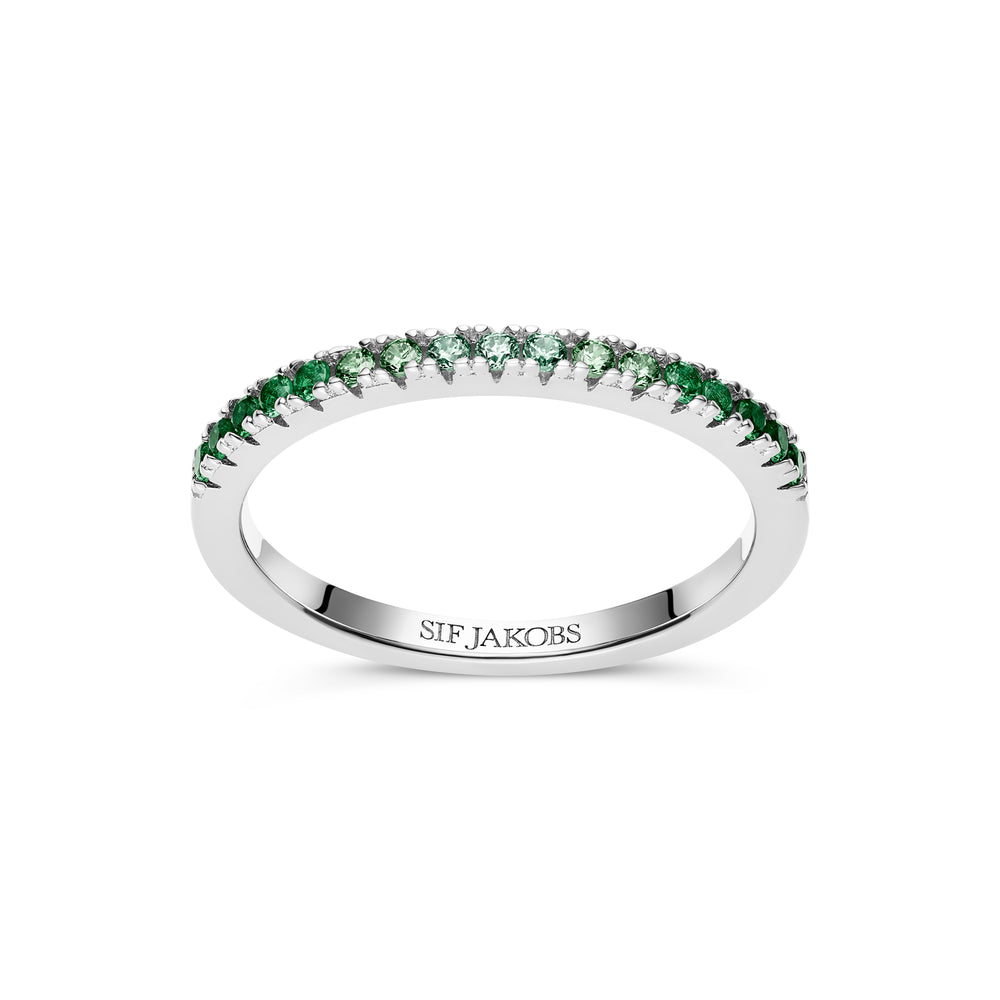 Ring tillverkad av 925 sterlingsilver med rhodium, polerad yta och infattad med facettslipade toner av gröna och vita zirkoner.