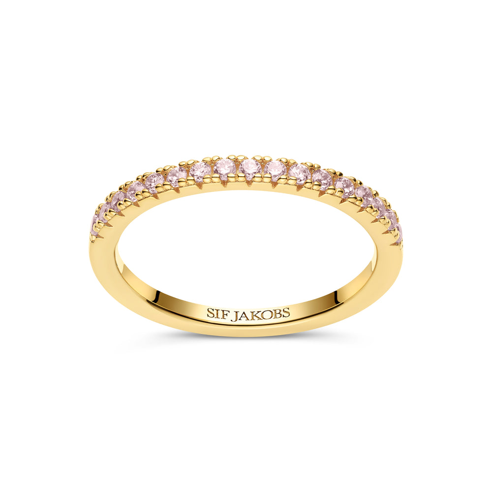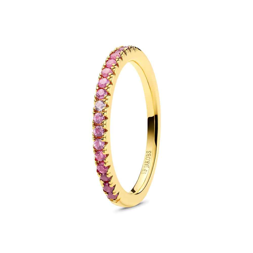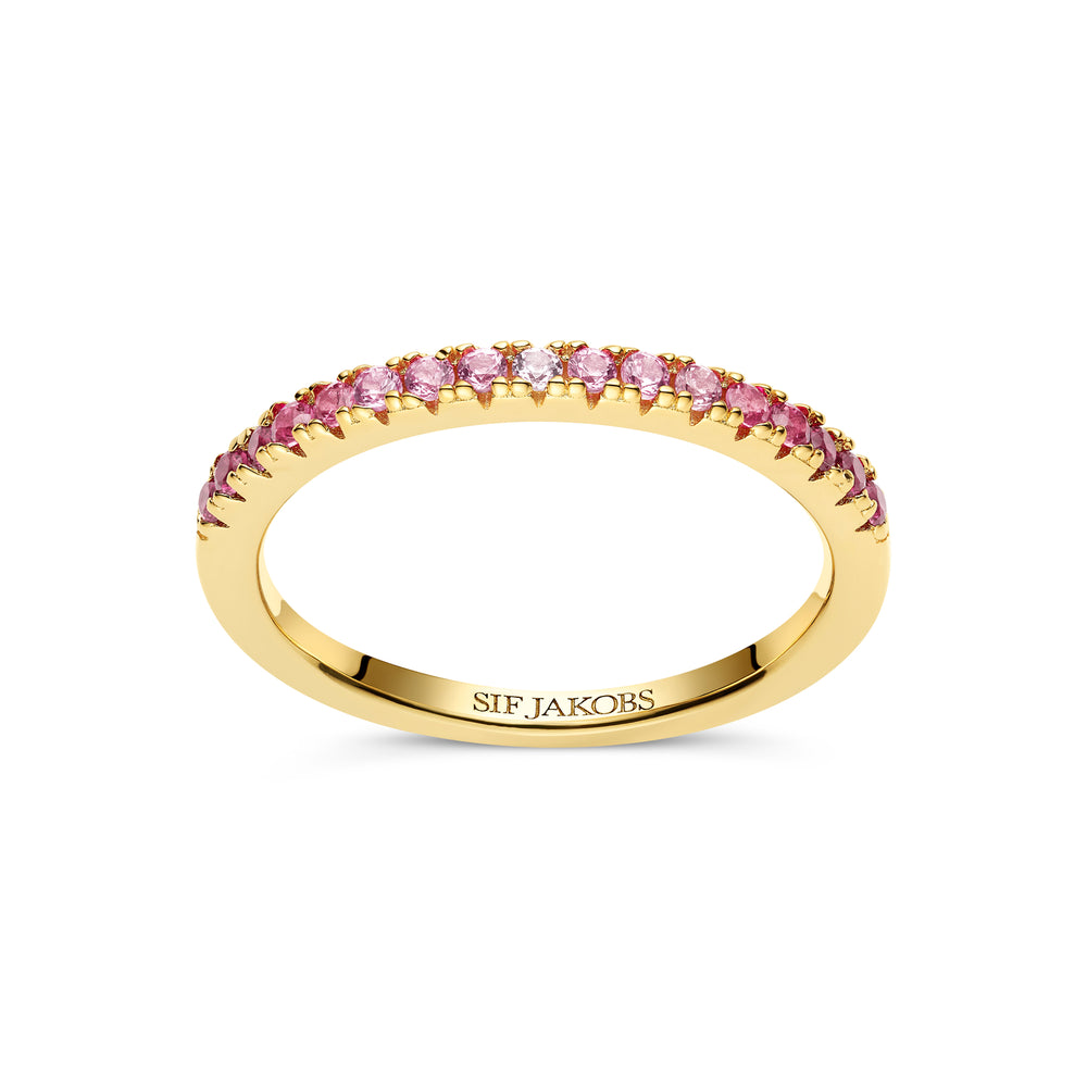 Ring tillverkad av 18 karat förgyllt 925 sterlingsilver, polerad yta och infattad med facettslipade toner av rosa och vita zirkoner.