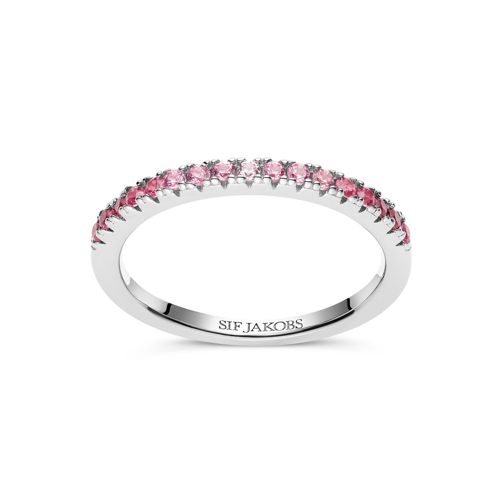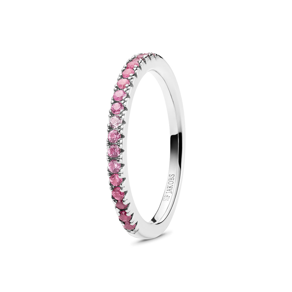 Ring tillverkad av 925 sterlingsilver med rhodium, polerad yta och infattad med facettslipade toner av rosa och vita zirkoner.