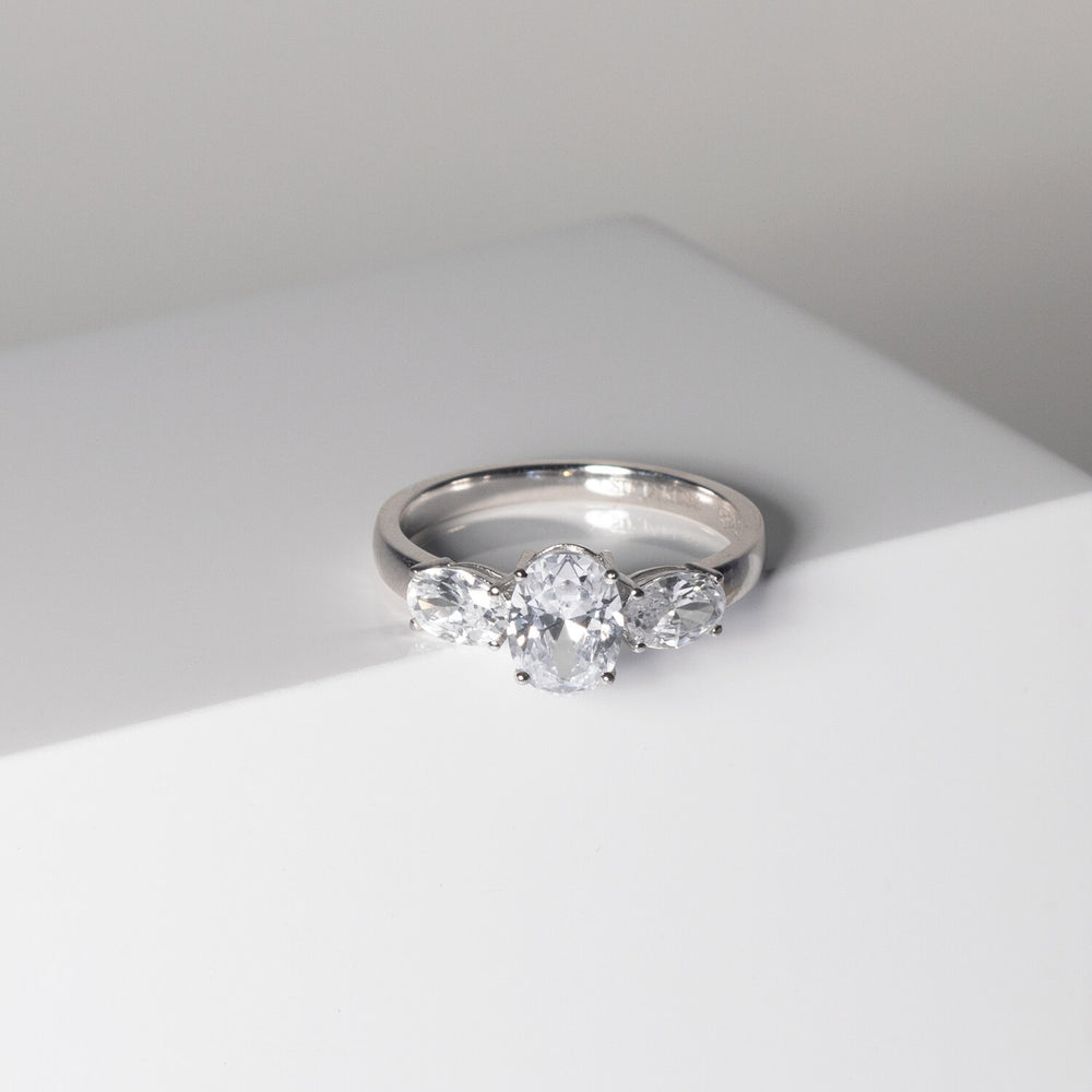 Ring av 925 Sterling Silver med rhodium, polerad yta och handplacerade facettslipade vita zirkoner.