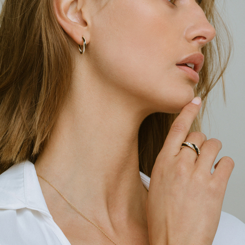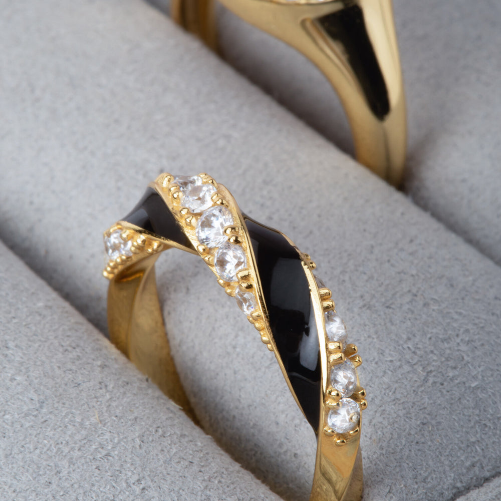Ring av 18 karat guldpläterad 925 Sterling silver, polerad yta och vita hand placerade skurna zirconia stenar och svart emalj.