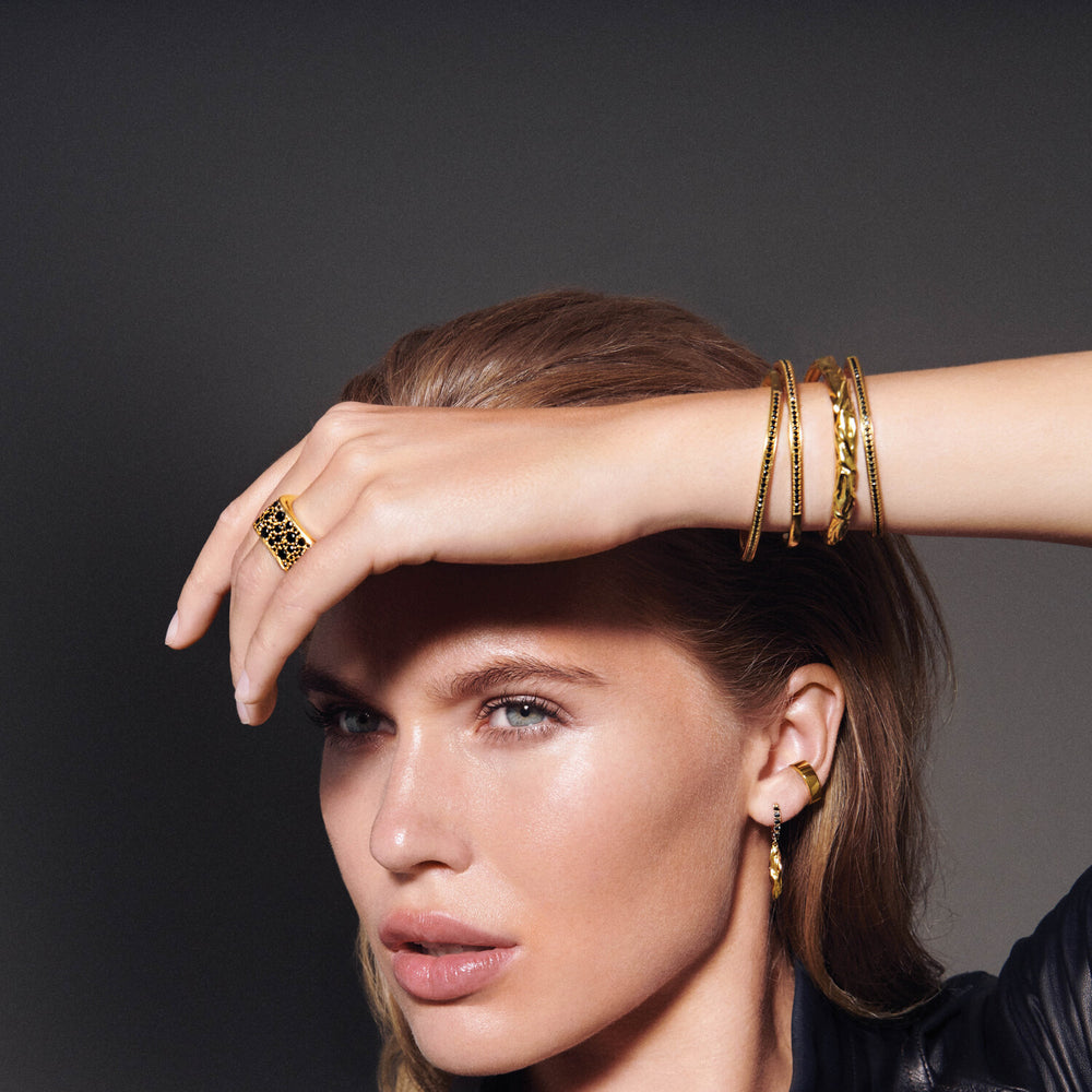 Ring i sterlingsilver 925 guldpläterad med 18 karat guld med polerad yta och fasetterade svarta zirkoner.