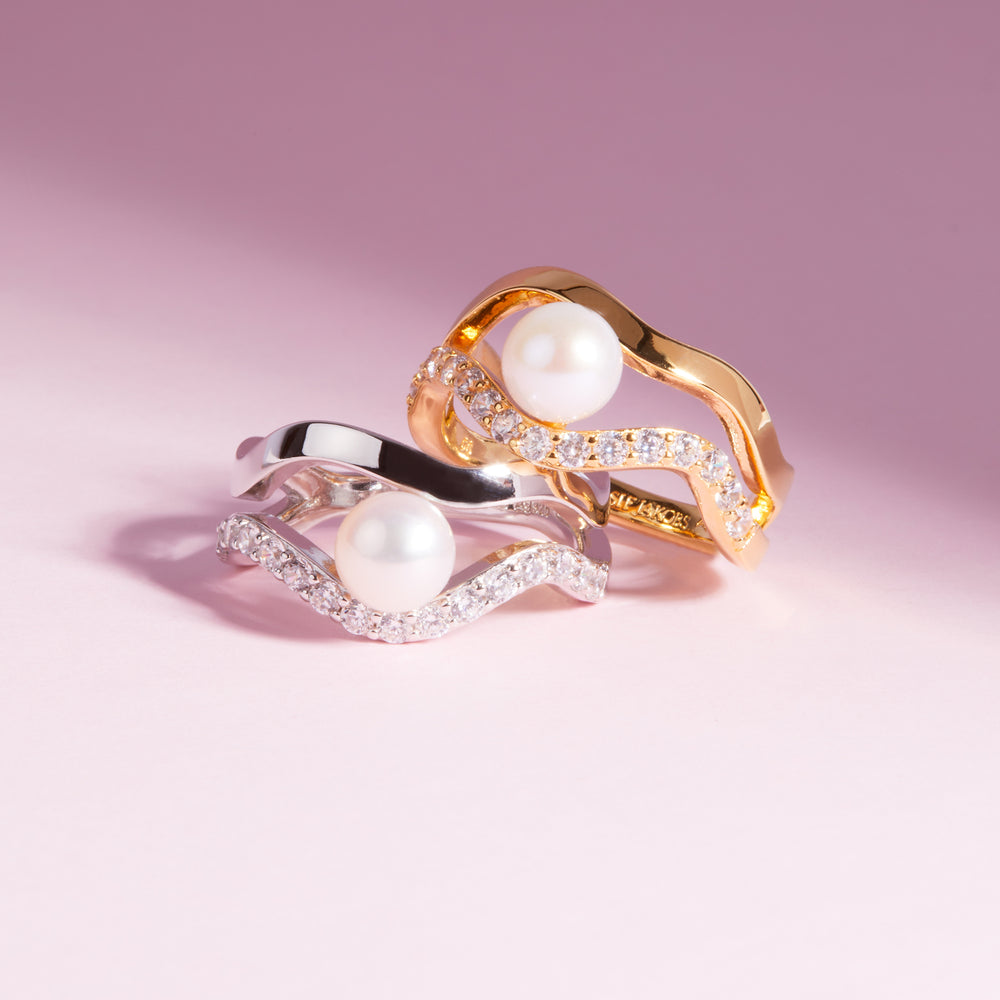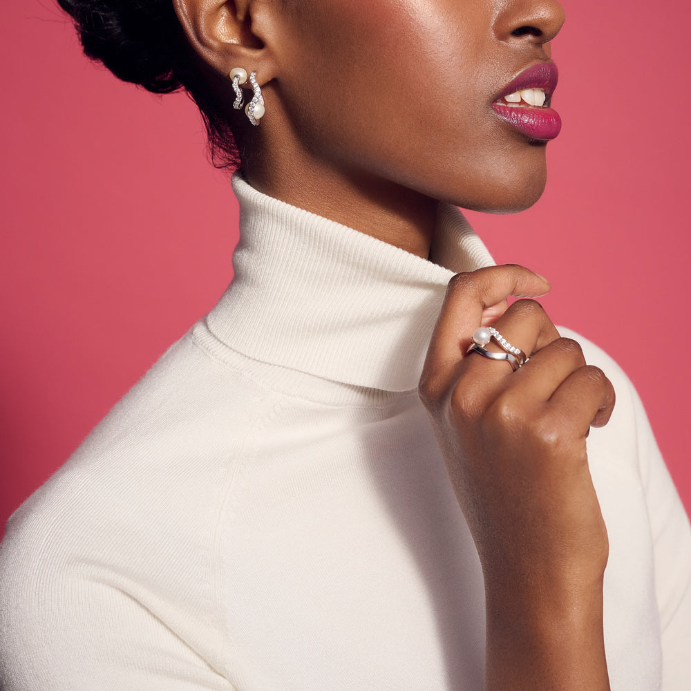 Ring i rhodinerat 925 Sterling silver med polerad yta och handplacerade facettslipade vita zirkoner och sötvattenspärlor.