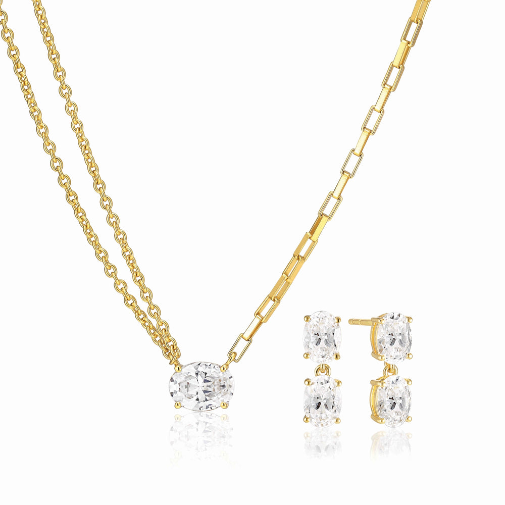 ELLISSE SET, det perfekta tillskottet till din smyckessamling. Tillverkat med precision och omsorg, skryter detta set med en fantastisk design i 18 karat guldplätering, förstärkt av de bländande vita zirkonia. ELLISSE SET är inkarnationen av elegans och sofistikation. Oavsett om du klär upp dig för en speciell kväll ute eller helt enkelt lägger till lite glitter i din vardagslook kommer detta set säkerligen att dra till sig uppmärksamhet. Nöj dig inte med något mindre än det bästa - beställ ditt ELLISSE SET idag och upplev den lyx och skönhet det har att erbjuda.