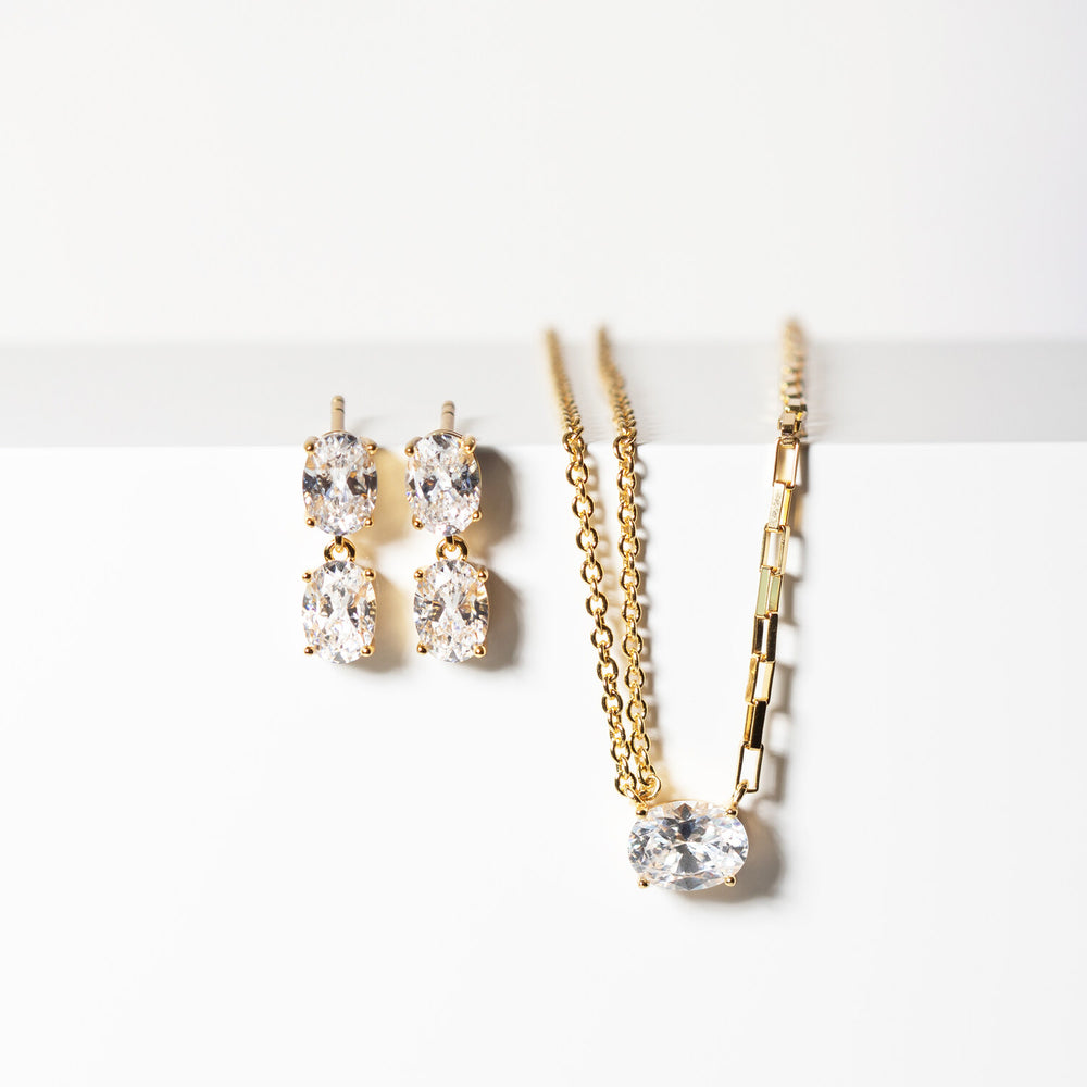 ELLISSE SET, det perfekta tillskottet till din smyckessamling. Tillverkat med precision och omsorg, skryter detta set med en fantastisk design i 18 karat guldplätering, förstärkt av de bländande vita zirkonia. ELLISSE SET är inkarnationen av elegans och sofistikation. Oavsett om du klär upp dig för en speciell kväll ute eller helt enkelt lägger till lite glitter i din vardagslook kommer detta set säkerligen att dra till sig uppmärksamhet. Nöj dig inte med något mindre än det bästa - beställ ditt ELLISSE SET idag och upplev den lyx och skönhet det har att erbjuda.